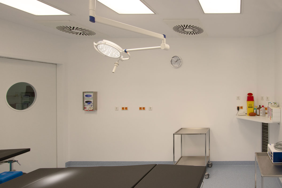 Für den Mietbereich Kinderchirurgie wurden neben 2 Reinraum-Umluftkühlgeräten zusätzlich eine Kompaktlüftungsanlage auf dem Dach des Gebäudes installiert. Diese versorgt insbesondere den OP-Bereich sowie den Rest der Räume mit vorkonditionierter und sauberer Luft. Auch hier kommen spezielle Filter zum Einsatz, um die Reinraum-Anforderungen der Chirurgie Praxis zu erfüllen.