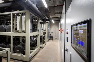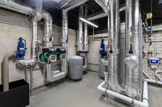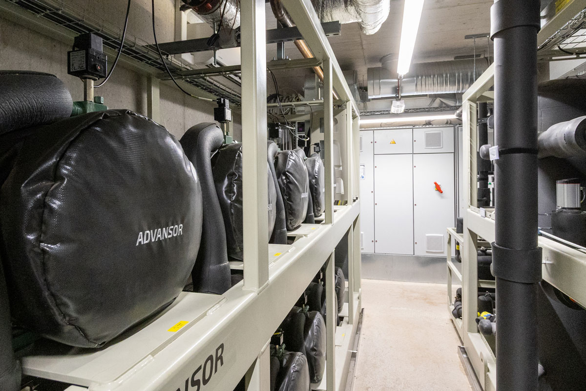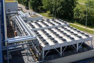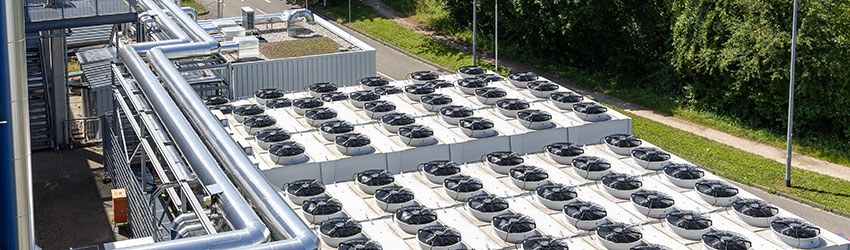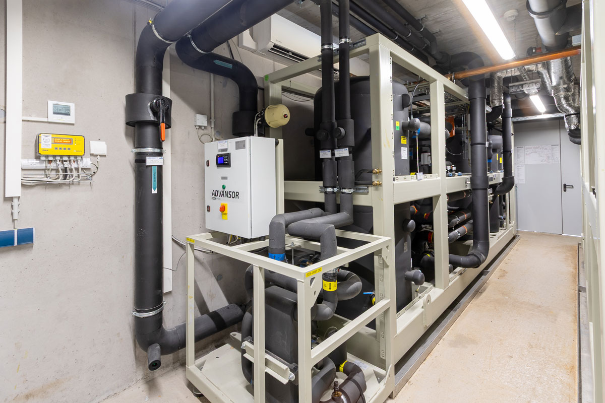 Die Ausführung erfolgte zweigeteilt mit zwei Luft-Wasser-Wärmepumpen inklusive Chiller. Dieses System von Advansor bietet eine Kühlleistung von 560 kW sowie eine Heizleistung von 1,6 MW. Die Wärmepumpen werden mit je 1.200 kg R744-Kältemittel betrieben.Eine besondere Herausforderung war die Demontage der alten Kesselanlage. Aufgrund des begrenzten Platzangebots im vorhandenen Technikraum wurde ein neuer Raum für beide Wärmepumpen eingerichtet. Die sechs Wärmepumpenverdampfer wurden auf der vorgesehenen Rohrleitungsbühne im Außenbereich installiert, die zur Aufstellung gerade ausreichend ist.